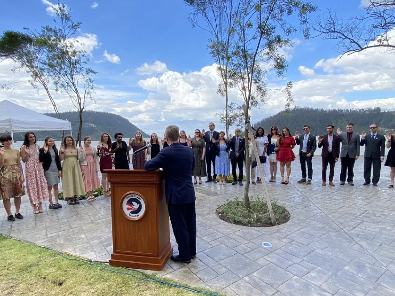 La ceremonia, que se realizó en la residencia del embajador de los Estados Unidos, contó con la presencia de Michael J. Fitzpatrick, embajador de EE.UU. en Ecuador; Michael A. Donald, director del Cuerpo de Paz; Esteban Amores, director nacional de Cooperación y Relaciones Internacionales Subrogante del Ministerio de Salud, y Washington Quinchuela, director nacional de juventudes del Ministerio de Inclusión Económica y Social (MIES).