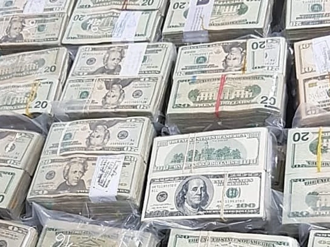 En las gráficas se aprecian maletas y cajas, así como varios paquetes de billetes, la mayoría de los cuales tienen como primera imagen denominaciones de veinte dólares, aunque también hay de cien y diez dólares.