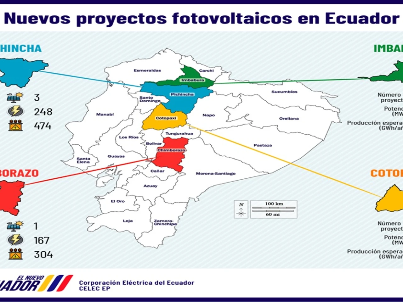 La Corporación Eléctrica del Ecuador (Celec), con la cooperación de la Agencia Francesa de Desarrollo (AFD), identificó un portafolio de siete proyectos de generación fotovoltaica, que totalizan 1.580 megavatios pico (MWp). Se ubican en Imbabura, Pichincha, Cotopaxi y Chimborazo.