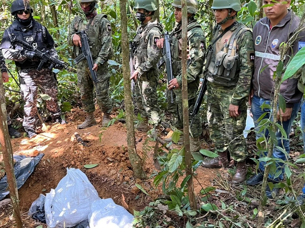 Según Expreso, “el material estaba en la vía al Recinto La Salinas, en el kilómetro 6 del cantón Lago Agrio. Se había empaquetado en fundas plásticas. Un total de seis bultos aproximadamente estaban escondidos en la maleza”.
