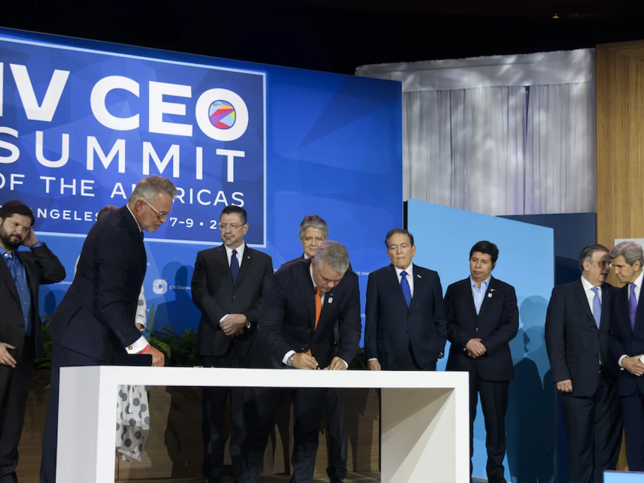 Uno detrás de otro, firmaron el documento Boric, sus colegas de Colombia, Iván Duque; Perú, José Pedro Castillo; Costa Rica, Rodrigo Chaves; Ecuador, Guillermo Lasso, y Panamá, Laurentino Cortiz, así como los jefes de la diplomacia de Canadá, Mélanie Joly, y de México, Marcelo Ebrard, y el encargado de asuntos de clima de EE.UU., John Kerry.