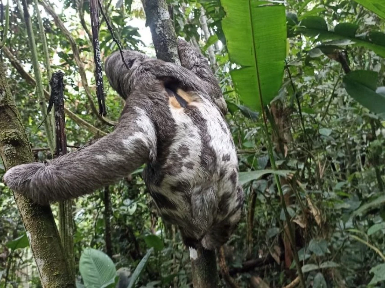 En Sucumbíos, un perezoso de dos garras fue rescatado por la Dirección Zonal 9. Tras verificar su buen estado de salud, fue liberado de inmediato en una zona de conservación.