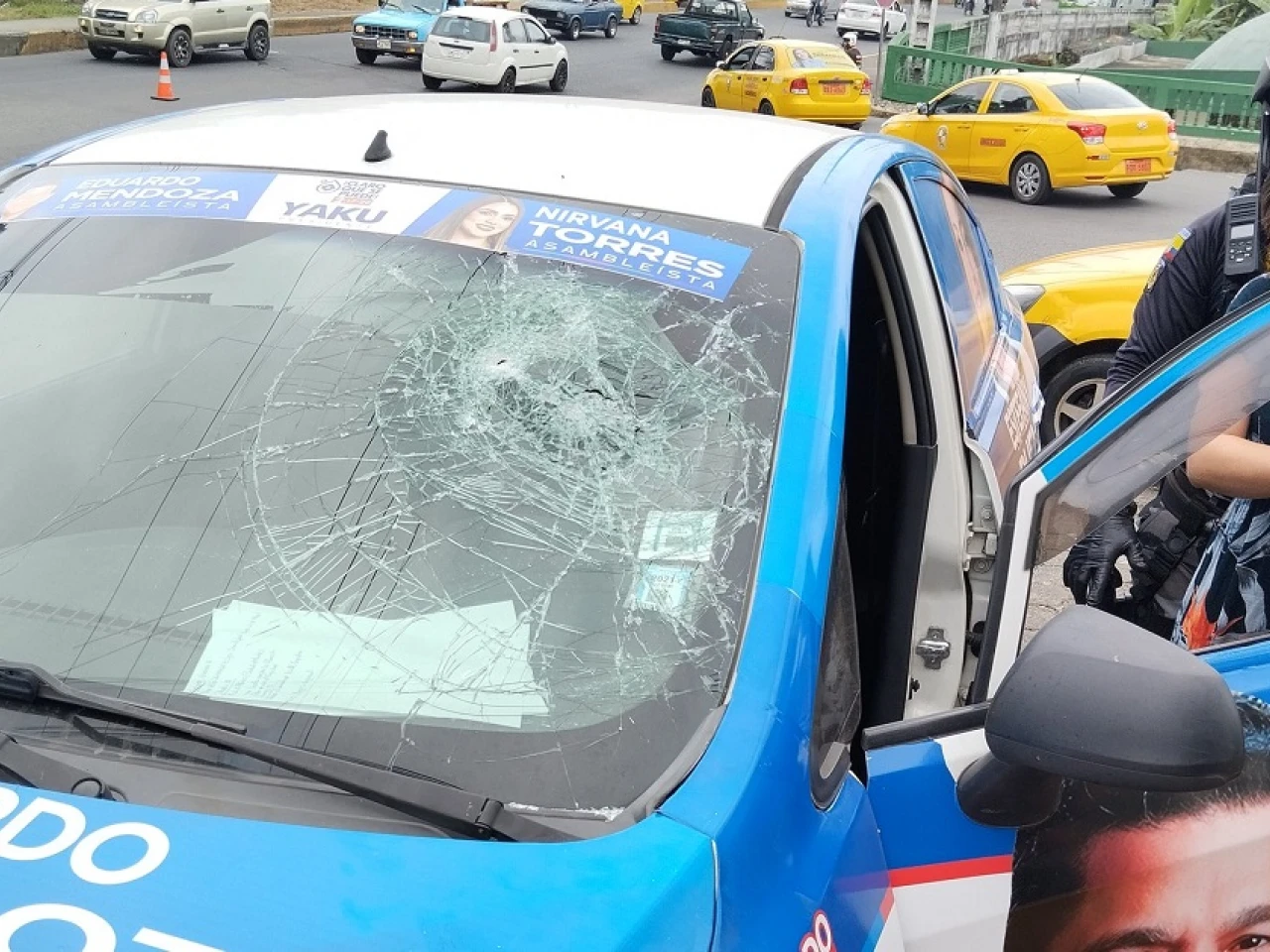 Las fotos difundidas en redes sociales y por medios locales muestran un vehículo con decoraciones de campaña electoral que ha recibido aparentemente un impacto de bala en el lado izquierdo del cristal frontal, donde va situado el conductor.