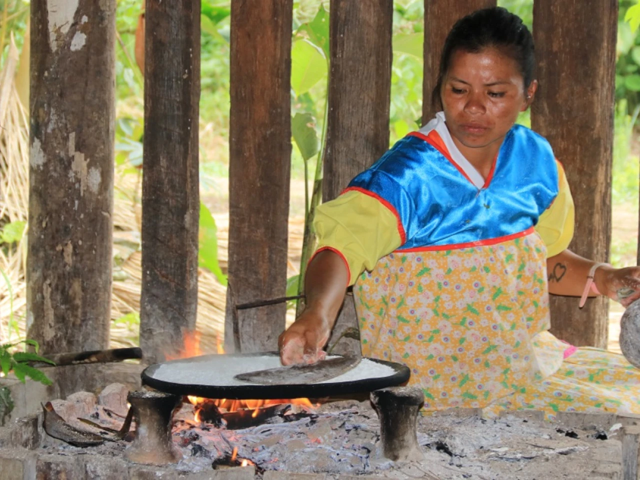 El popular alimento de varias comunidades amazónicas en Ecuador, el casabe, se obtiene de la yuca. Mujeres de las comunidades Siona y Secoya se encargan de su elaboración.