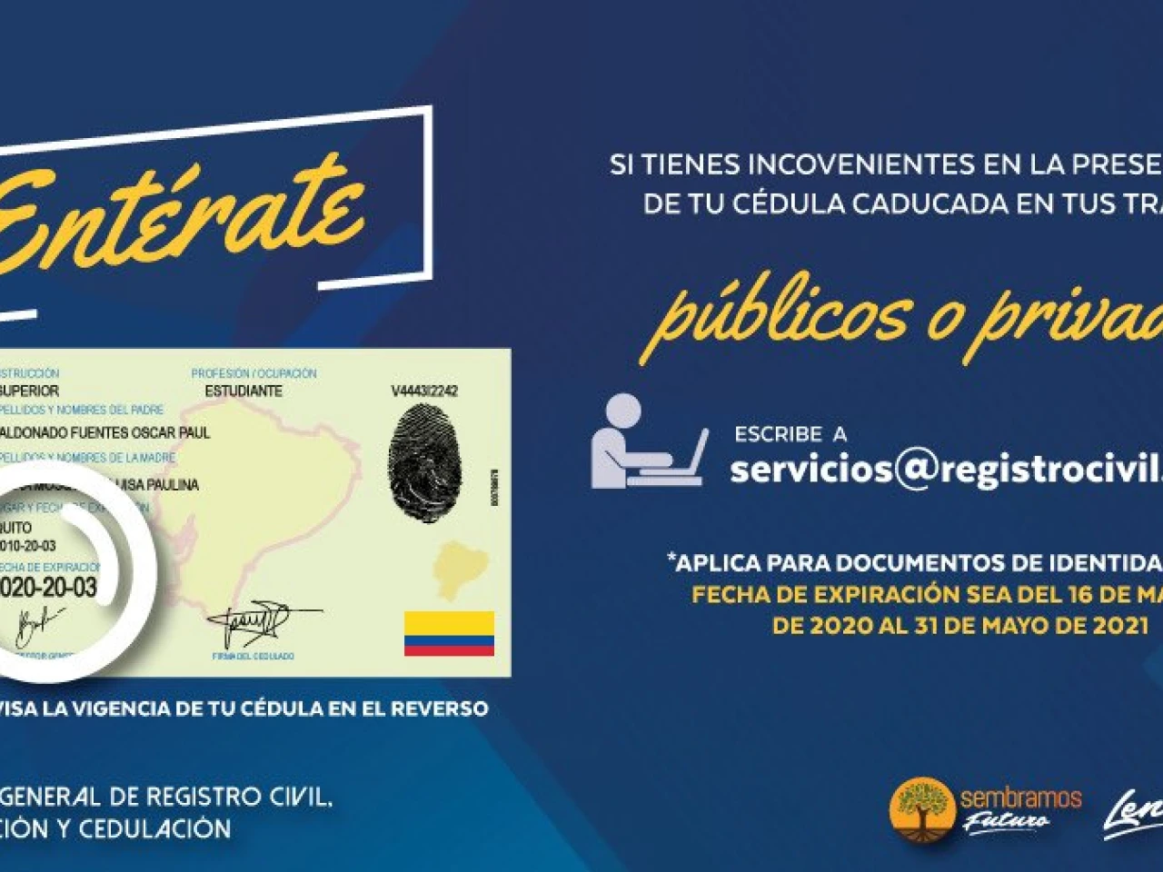 Y se fundamenta en que durante la vigencia del estado de excepción decretado por el presidente, Lenín Moreno, a mediados de marzo pasado, "la prestación del servicio de emisión de cédulas de identidad a la ciudadanía se ha venido ejecutando de manera limitada debido a las restricciones laborales y de aforo establecidas por el Comité de Operaciones de Emergencia".