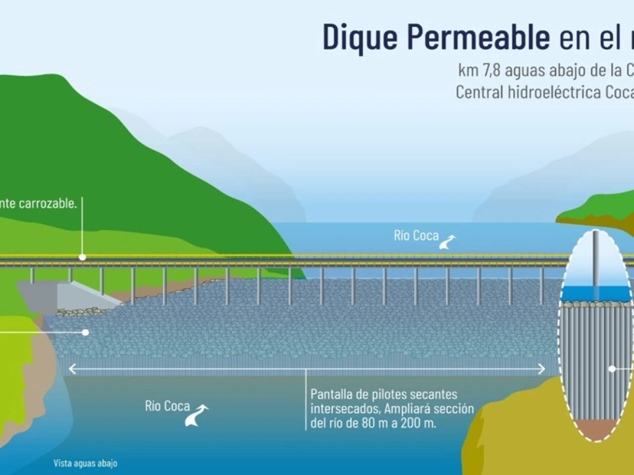 La institución también informó que las obras ampliarán la sección hidráulica del río Coca, de aproximadamente 80 metros a 200 metros, para reducir el poder erosivo del agua.