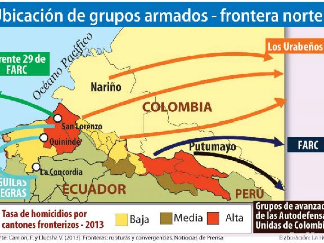 El Frente 29 de las Fuerzas Armadas Revolucionarias de Colombia (FARC), Los Urabeños, Águilas Negras, las FARC y Grupos de Avanzada de las Autodefensas Unidas de Colombia (AUC) son los grupos armados que actúan en la frontera norte y que han sido identificados por el Ecuador. (Ver gráfico)