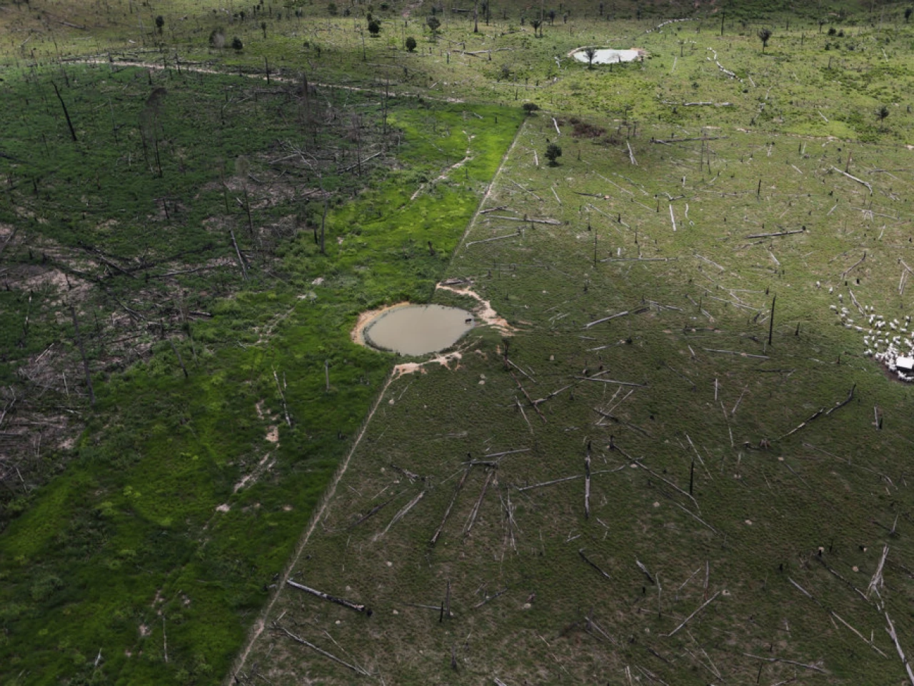 En esta toma aérea de 2013 se ve una zona deforestada de la Amazonía, en el estado de Pará, en donde unas vacas, a la derecha, pastan. Credit Nacho Doce/Reuters