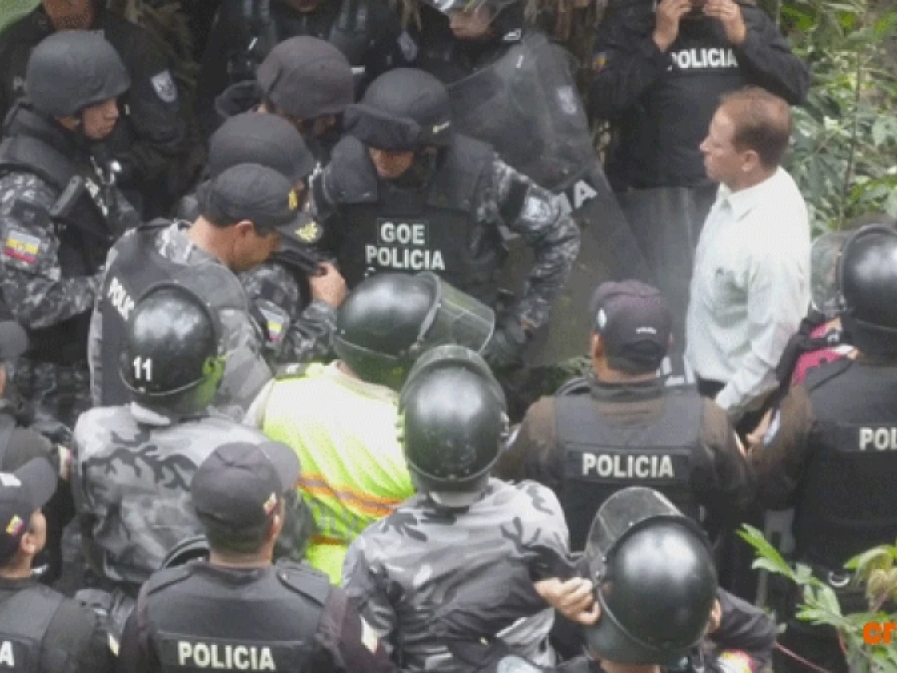 Los uniformados se concentraron en tres frentes, resguardaban a los funcionarios municipales que encabezaban la apertura del sendero ecológico, mismo que atraviesa por varios predios de los sectores Rumishitana y los antes mencionados.