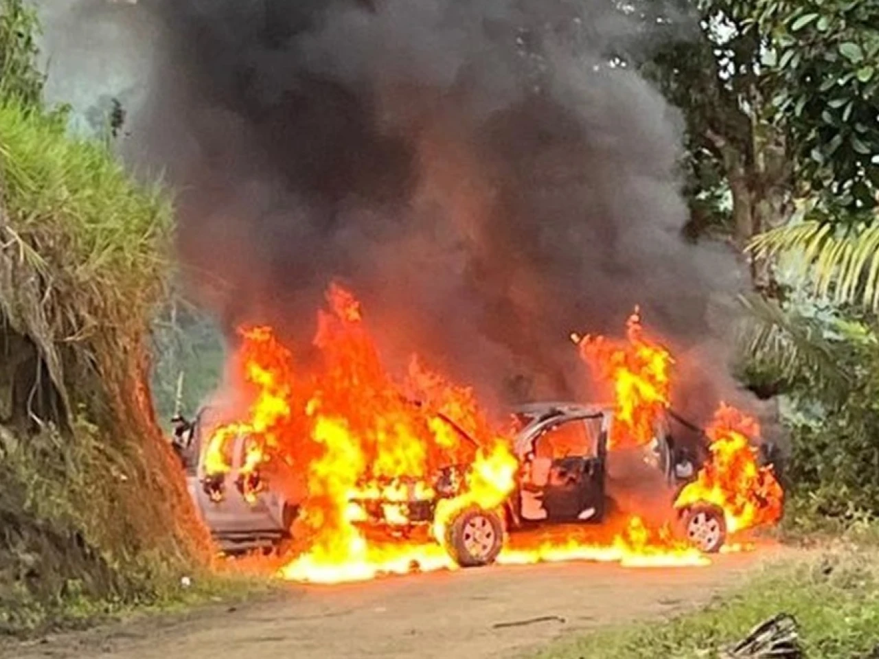 2 vehículos fueron quemados durante la protesta antiminera en Sigchos / Foto: cortesía Policía Nacional