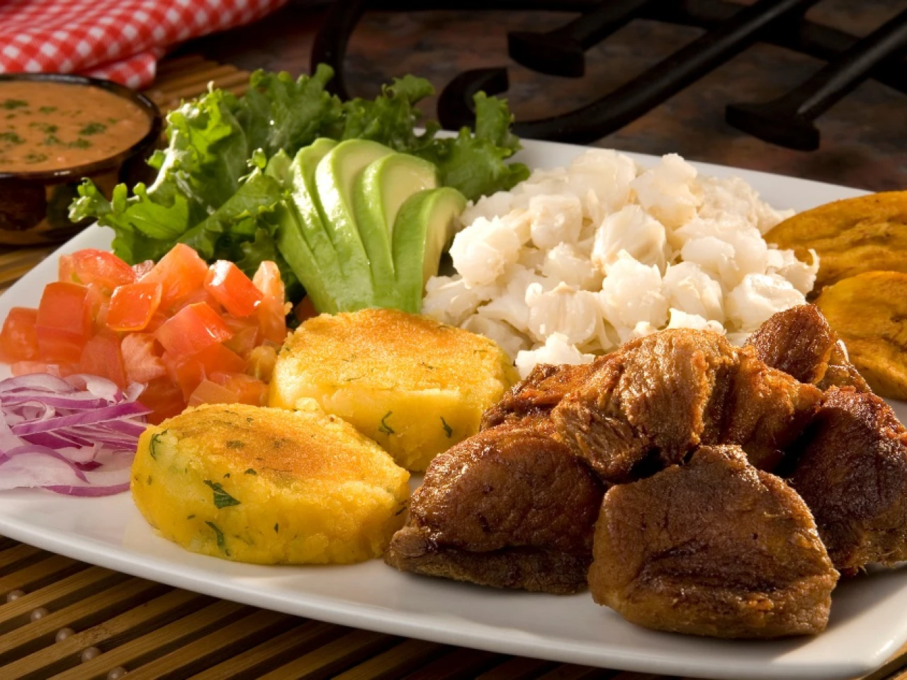 Fritada: La carne de cerdo es la protagonista de este platillo típico de la gastronomía de la Sierra. Se la cocina en agua y zumo de naranja con cominos y más especias y se sirve acompañada con mote, salsa de cebolla, aguacate, papas asadas, chifles y plátanos maduros fritos.