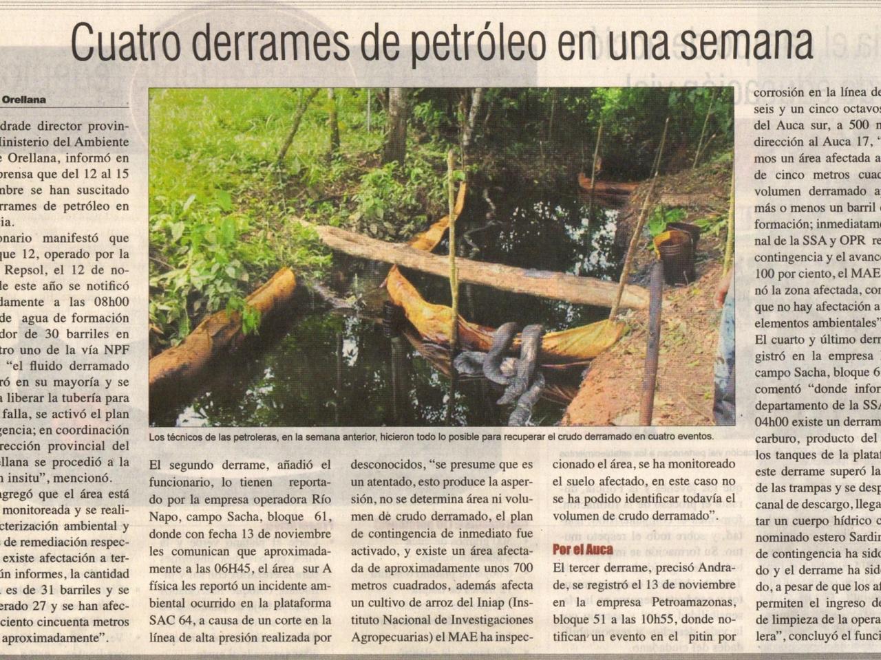 El funcionario manifestó que en el bloque 12, operado por la compañía Repsol, el 12 de noviembre de este año se notificó aproximadamente a las 08h00 una fuga de agua de formación de alrededor de 30 barriles en el kilómetro uno de la vía NPF Tibacuno, "el fluido derramado se recuperó en su mayoría y se procedió a liberar la tubería para reparar la falla, se activó el plan de contingencia; en coordinación con la dirección provincial del MAE Orellana se procedió a la inspección in situ", mencionó.