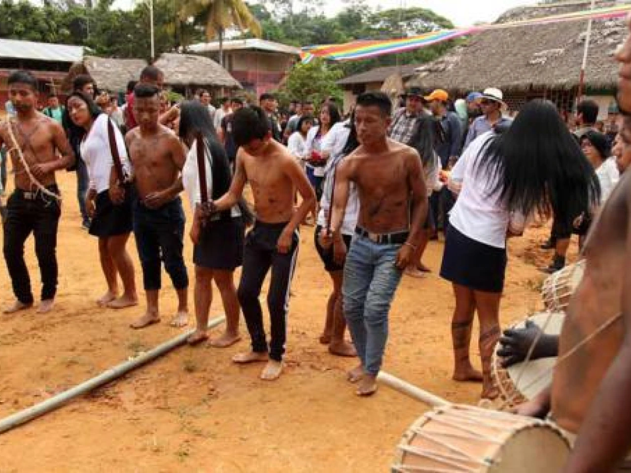 Los tambores también acompañan el baile de las mujeres de la comunidad. Ellas pintan figuras en su cara con tinta de wituk, dejan su cabello suelto y llevan cestas con flores recogidas en la selva, para distinguirse de entre los demás asistentes.