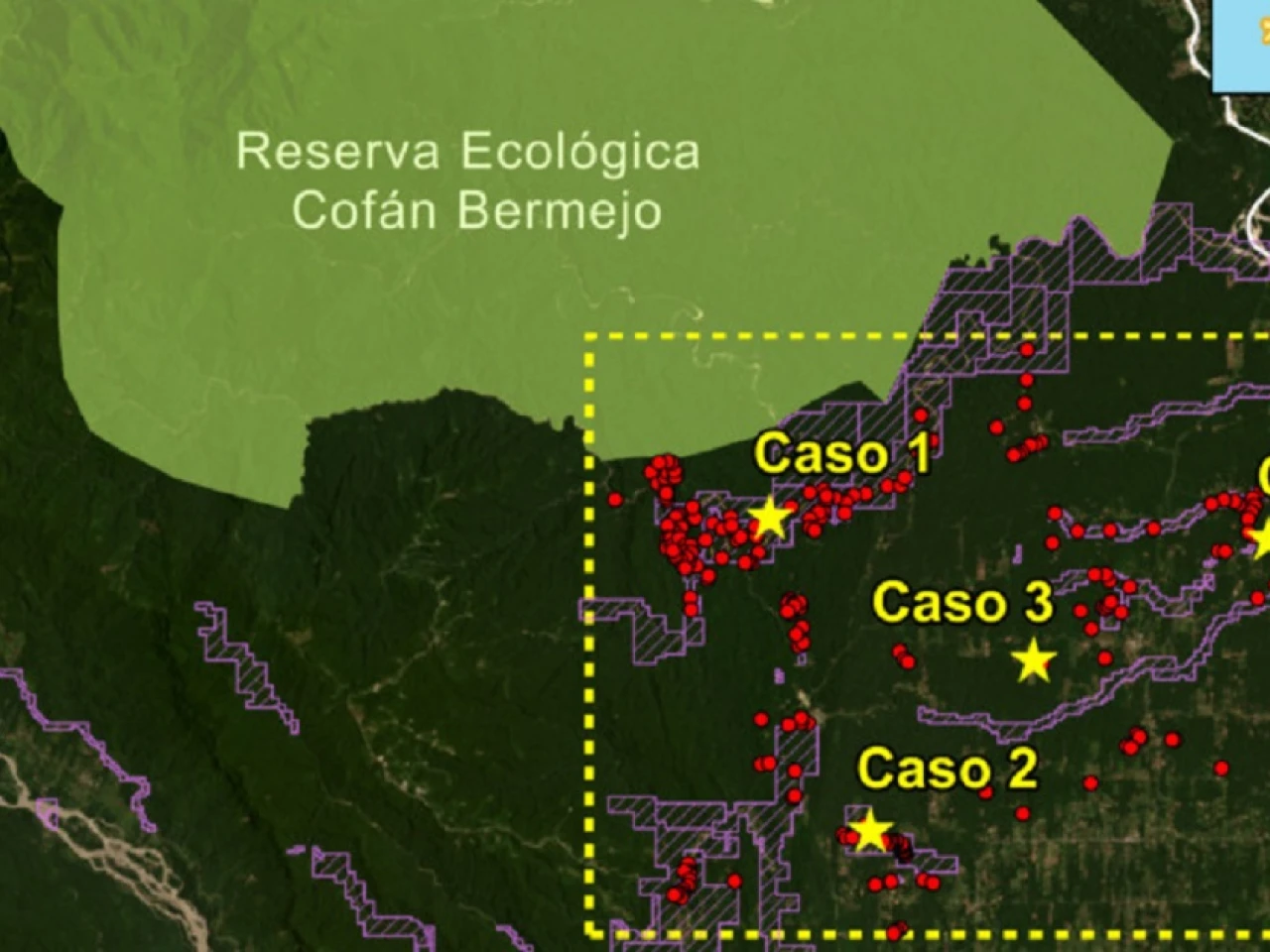 Uno de los principales puntos de deforestación está a lo largo del río Bermejo dentro de la zona de amortiguamiento de dicha Reserva Ecológica, un espacio de transición en la cual converge con la Tierra Comunitaria Cofán-Bermejo.