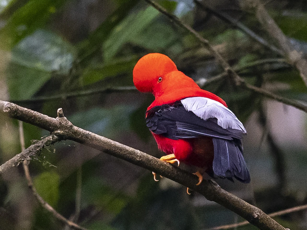 Toca madrugar para encontrar el gallito de las rocas (rupicola peruviana), también conocido el gallito de la peña, pues por su estridente color rojo, que parece hacerlo una presa fácil, trata de no exhibirse mucho, cuenta EFE el guía Rolando García, de la reserva privada Las Cotingas.