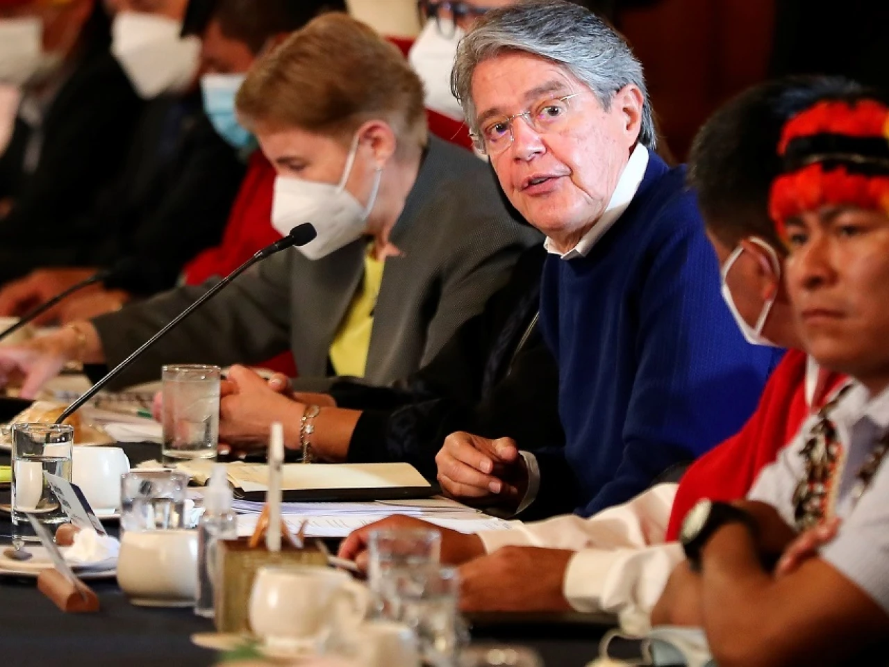 El presidente Guillermo Lasso, con varios de sus colaboradores, se reunió con los máximos dirigentes de la Confederación de Nacionalidades Indígenas del Ecuador (Conaie).