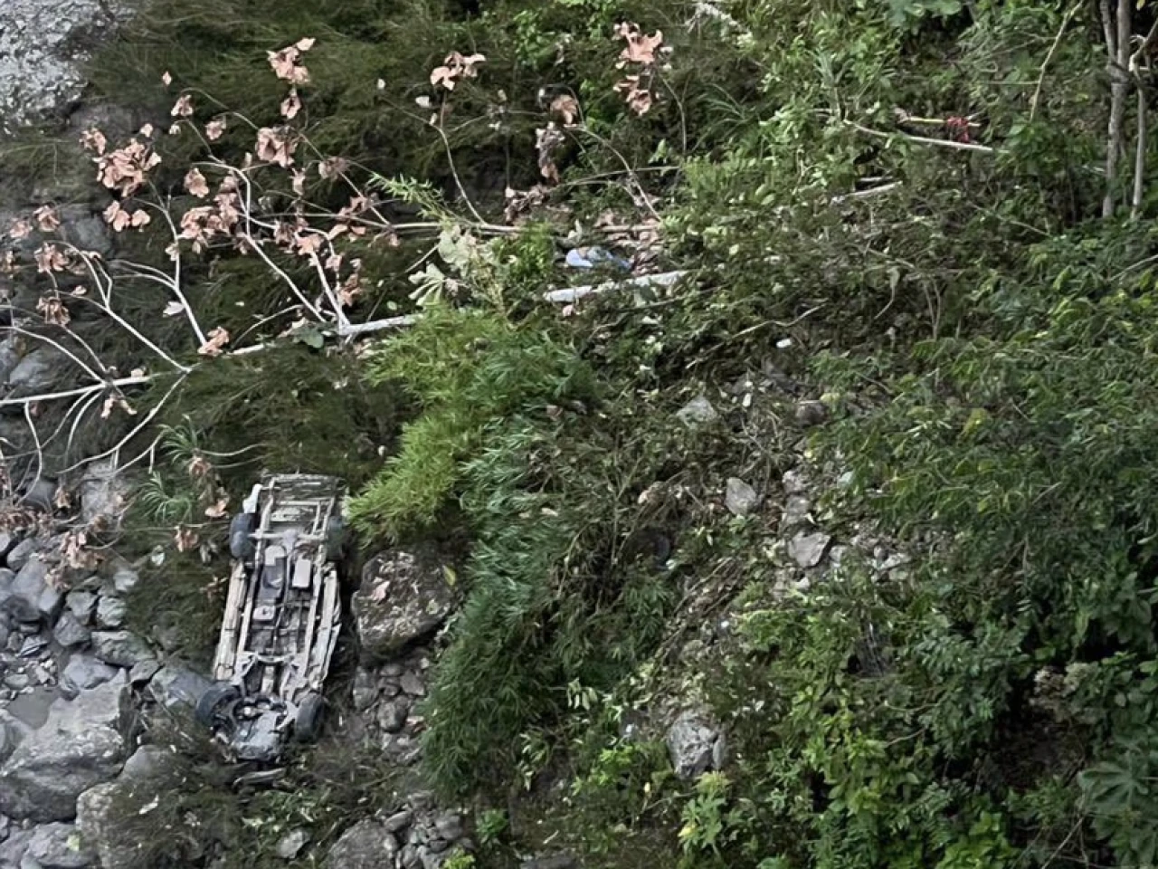 Una camioneta perdió la pista y se estrelló antes de caer a un barranco del río Paute./ Foto: cortesía