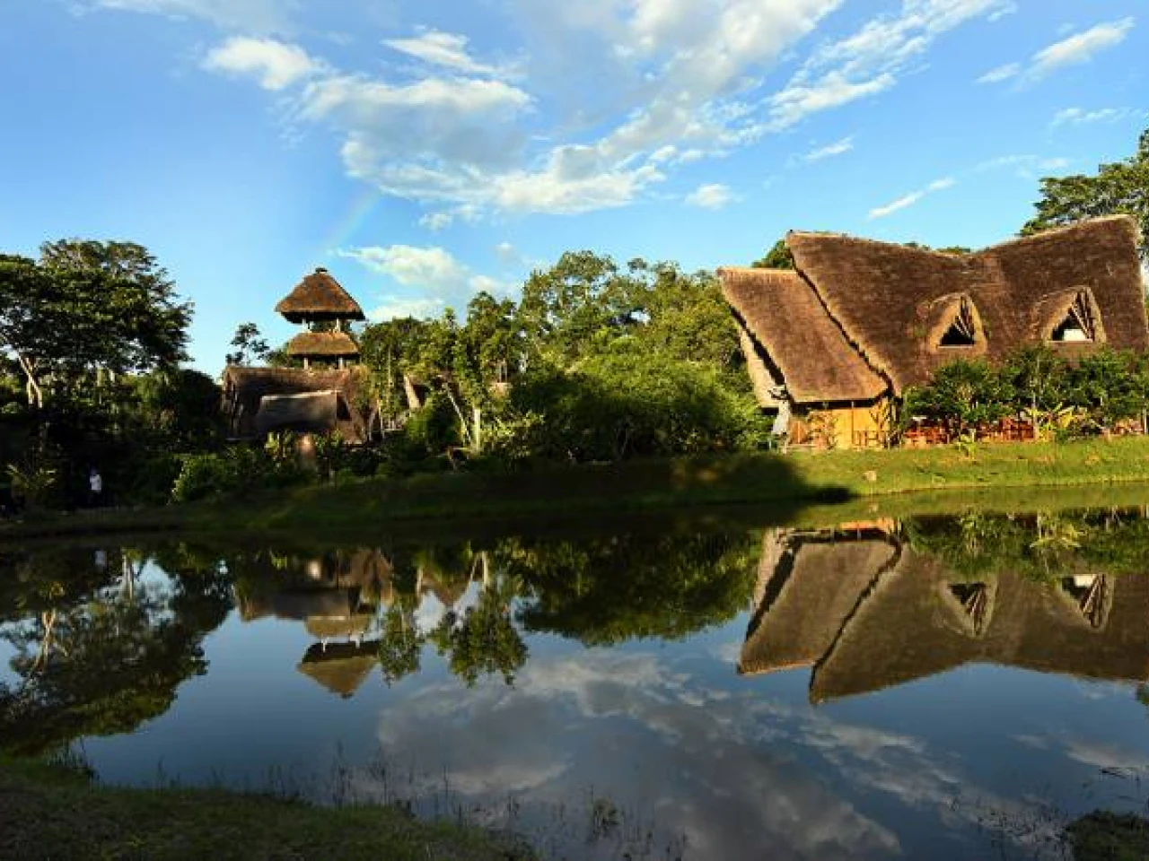 Cuatro chozas tradicionales de madera, caña guadúa y paja toquilla, que conforman el Centro Turístico Sinchi Warmi, en la parroquia Misahuallí, del cantón Tena, en la provincia del Napo, se reflejan en una de las dos piscinas artificiales que usan para que los turistas practiquen pesca deportiva.