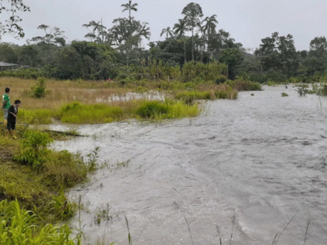 Por las intensas lluvias registradas este sábado 2 de mayo de 2020 en el cantón Morona se desbordó el río Upano. Eso afectó a numerosas personas y familias que habitan en las márgenes de afluencia, de manera especial, en la zona de San Luis.