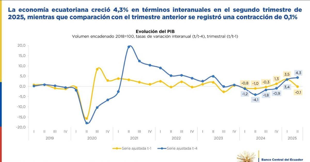 Quito- La economía del Ecuador registró un crecimiento interanual del 4,3 % durante el segundo trimestre de 2025. Estuvo impulsado por la recuperación del consumo de los hogares, el aumento de las exportaciones no petroleras y el repunte de la inversión. Así lo detalló el Banco Central del Ecuador (BCE).