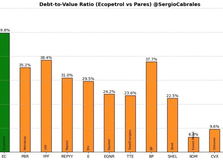 Este indicador, que mide el peso de los pasivos frente al valor total de mercado de una empresa, ubica a Ecopetrol con un 49,8%, muy por encima de gigantes de la industria como ExxonMobil, que registra apenas un 6,1%, y Chevron, con un 9,6%. Incluso compañías tradicionalmente apalancadas como BP se mantienen por debajo, con un 37,7%.