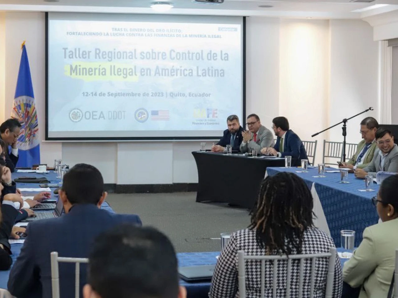 El ministro del Interior, Juan Zapata; junto a Gastón Schulmeister, director del Departamento contra la Delincuencia Organizada Transnacional de la Organización de Estados Americanos (OEA); Liv Kilpatrick, directora de la Oficina Antinarcóticos y Aplicación de la Ley (INL); y, representantes de la Unidad de Análisis Financiero y Económico, inauguró el Taller Regional sobre Control de la Minería Ilegal en América Latina.