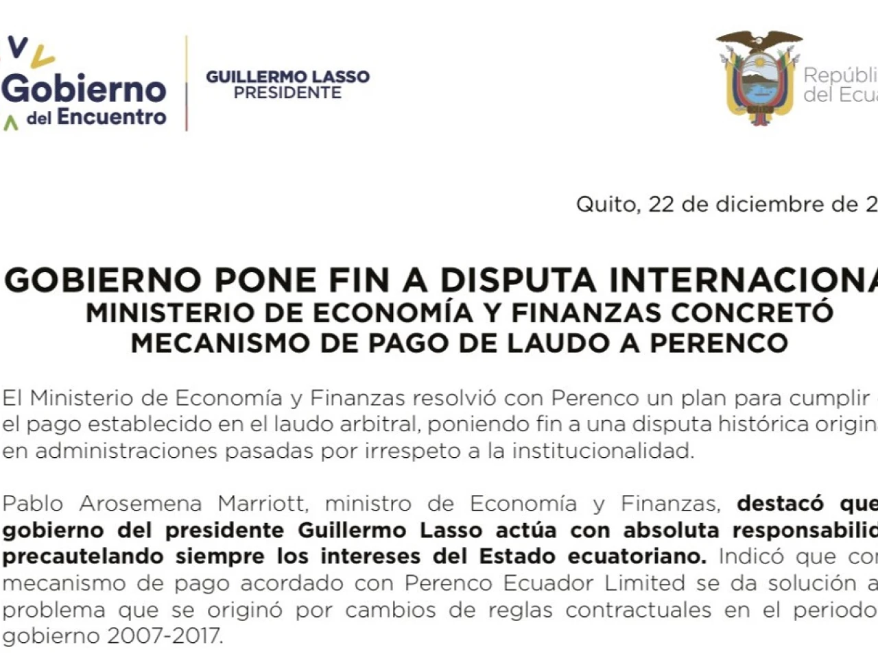 Se ha acordado un cronograma de pagos que se extiende hasta finales de 2023, indicó el Ministerio en un comunicado, en el que anotó que Perenco, a través de uno de sus voceros, "agradeció la determinación y el respeto a la institucionalidad por parte del Estado ecuatoriano".
