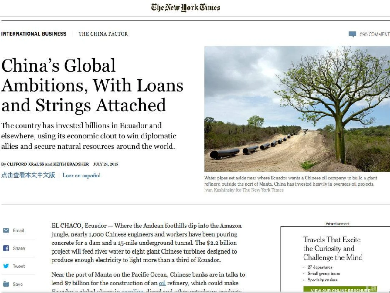 Los periodistas Clifford Krauss y Keith Bradsher investigaron para el periódico The New York Times las implicaciones de la inversión de China en Ecuador en un amplio reportaje. En un estudio global, Ecuador es el país de América Latina que más recursos recibe del gigante asiático. Según The New York Times, China aporta el 57% de toda la inversión extranjera en el país.