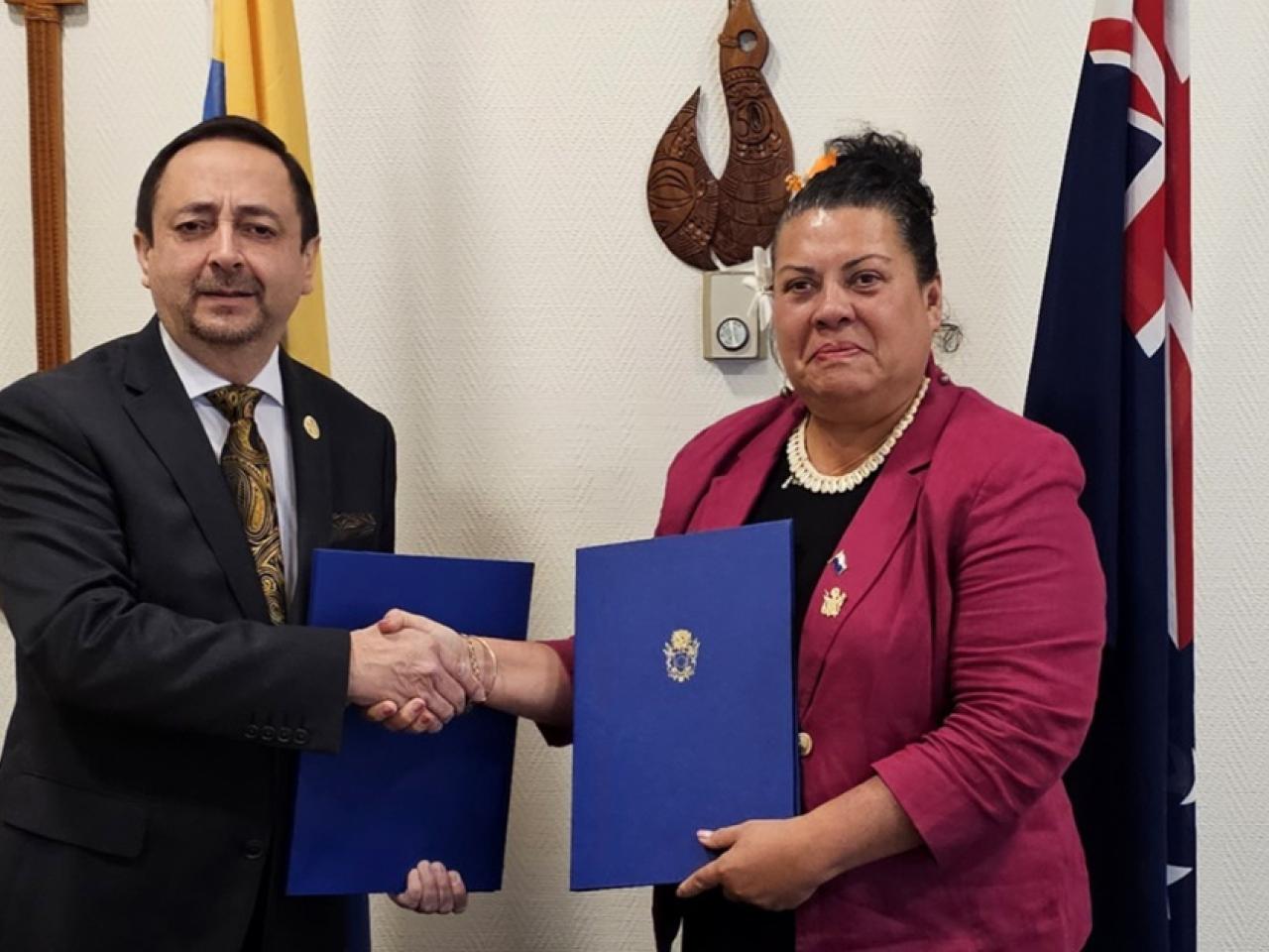 El comunicado conjunto de establecimiento de relaciones diplomáticas fue suscrito por el embajador de Ecuador en Australia, Arturo Cabrera, y la Alta Comisionada de Islas Cook en Wellington, Kairangi Samuela.
