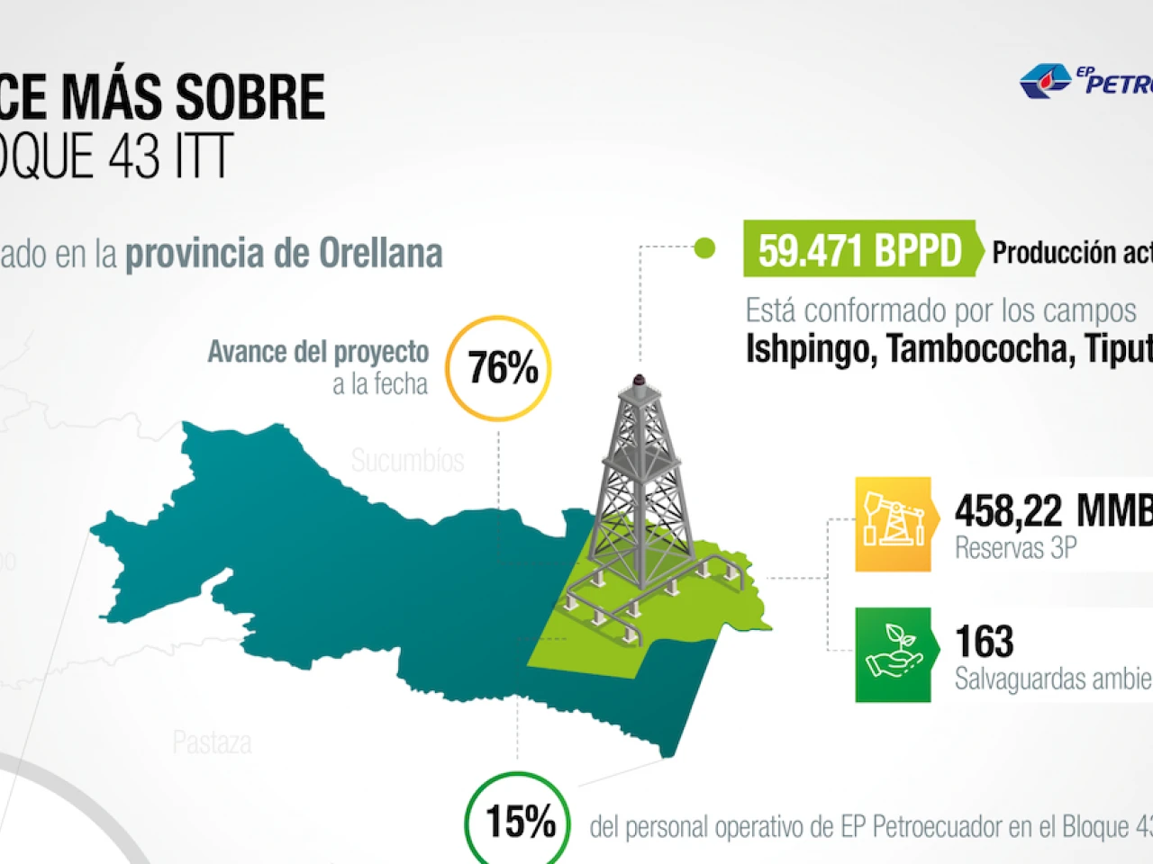 Con un avance del 76 %, actualmente el Bloque 43-ITT produce 59.471 barriles de petróleo diarios, de los cuales 36.597 corresponden al área Tambococha y 22.874 al área Tiputini.