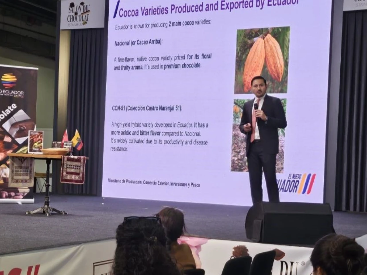 Ankara- Ecuador reafirmó su liderazgo como proveedor mundial de cacao fino de aroma durante el ‘Salon du Chocolat Istanbul 2025’, uno de los encuentros más relevantes del sector chocolatero en Turquía. La Oficina Comercial de ProEcuador en Ankara tuvo una destacada participación en el evento, con una conferencia y una muestra de productos ecuatorianos que captaron la atención de empresarios, chefs reposteros y representantes clave de la industria del chocolate.