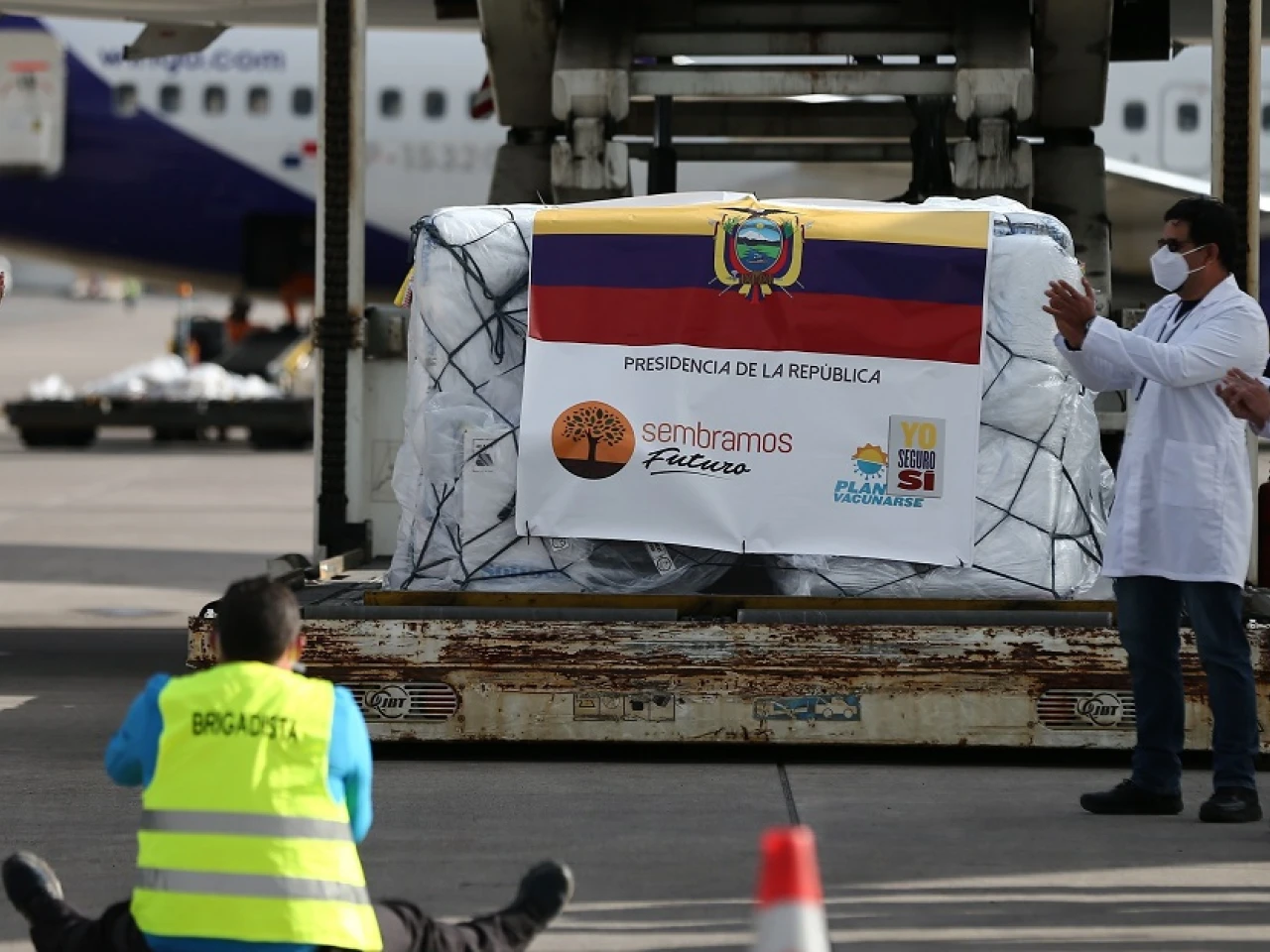 Sobre la pista, el presidente ecuatoriano, Lenín Moreno, encabezó una ceremonia de recepción de este primer cargamento, que servirá para inmunizar al personal sanitario de la "primera línea" y para ancianos de los centros geriátricos.