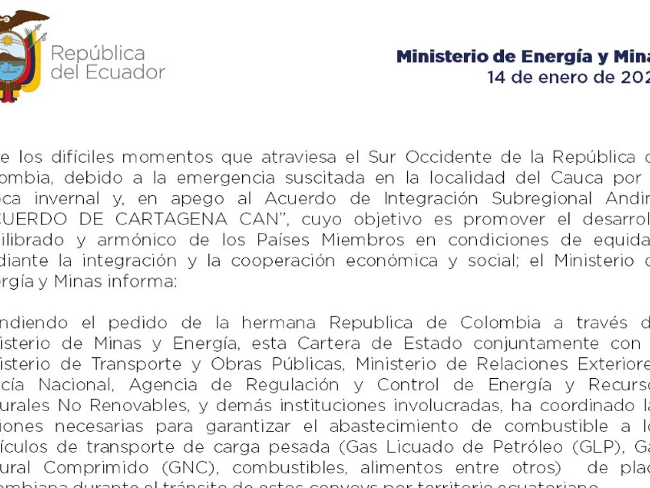 Se han "coordinado las acciones necesarias para garantizar el abastecimiento de combustibles a los vehículos de transporte de carga pesada (gas licuado de petróleo, gas natural comprimido, combustibles, alimentos, entre otros) de placa (chapa) colombiana durante el tránsito de esos convoy por territorio ecuatoriano".