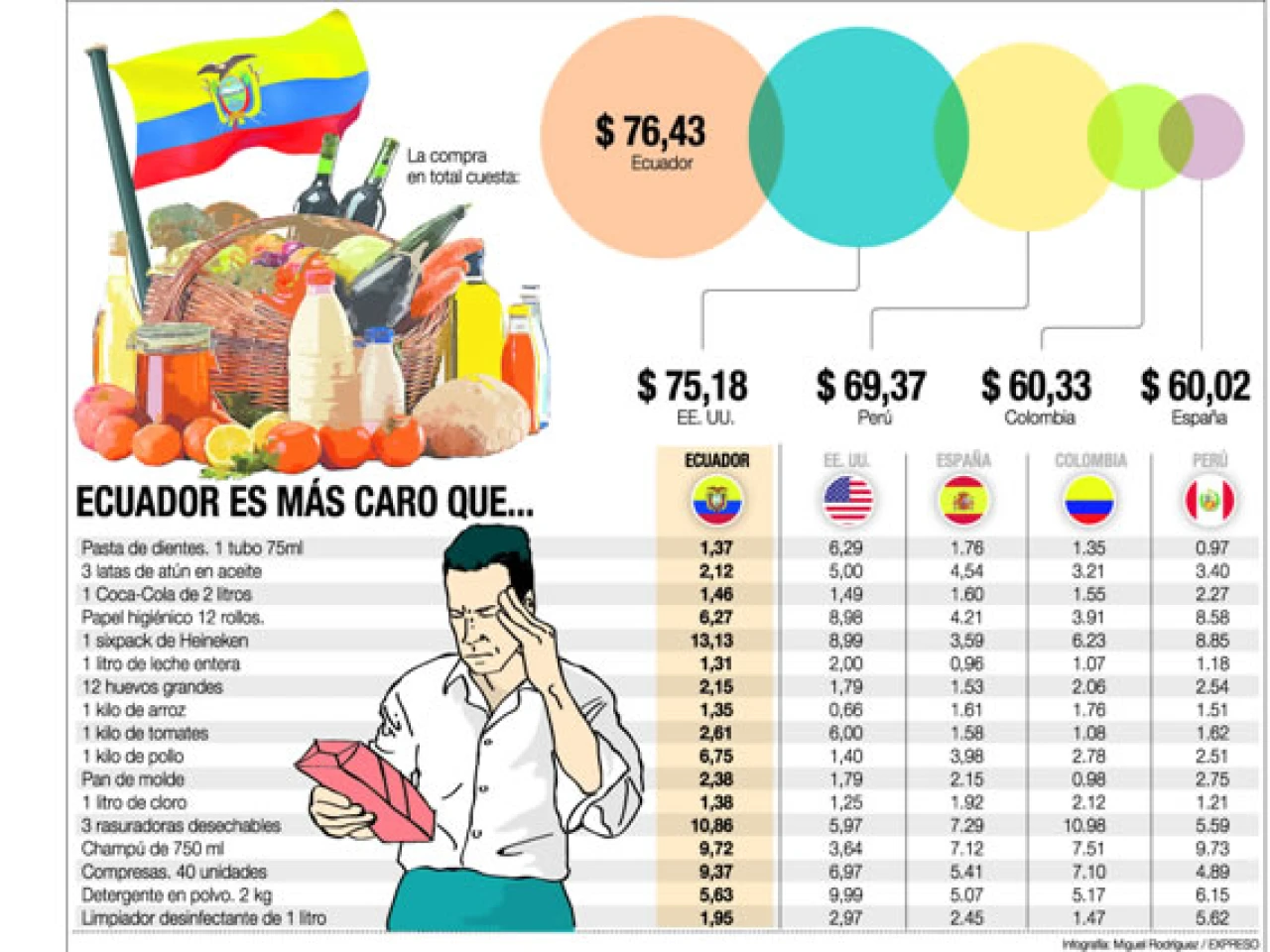 Vivir cuesta. La comida cuesta. La limpieza cuesta. El aseo cuesta. El ocio cuesta. Hacer la compra cuesta. Pero es más caro para un ecuatoriano que viva en su país que para un compatriota que lleve el mismo tren de vida en Estados Unidos, España, Colombia o Perú.