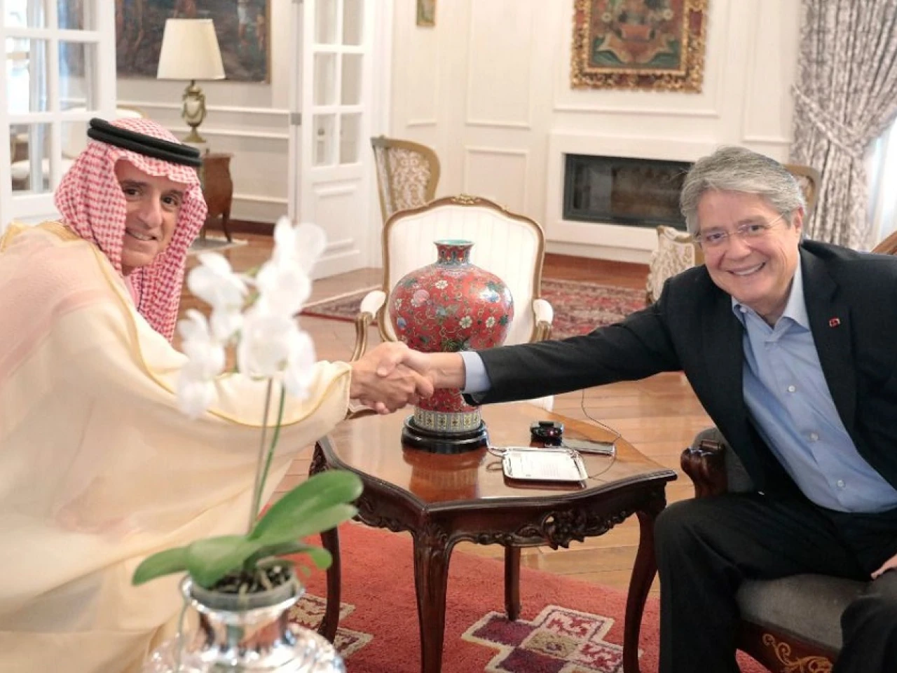 El presidente de Ecuador, Guillermo Lasso, y su canciller, Juan Carlos Holguín, se reunieron este domingo con el ministro de Estado de Asuntos Exteriores de Arabia Saudí, Adel bin Ahmed Al-Jubeir, para fortalecer las relaciones y la cooperación entre los dos países.