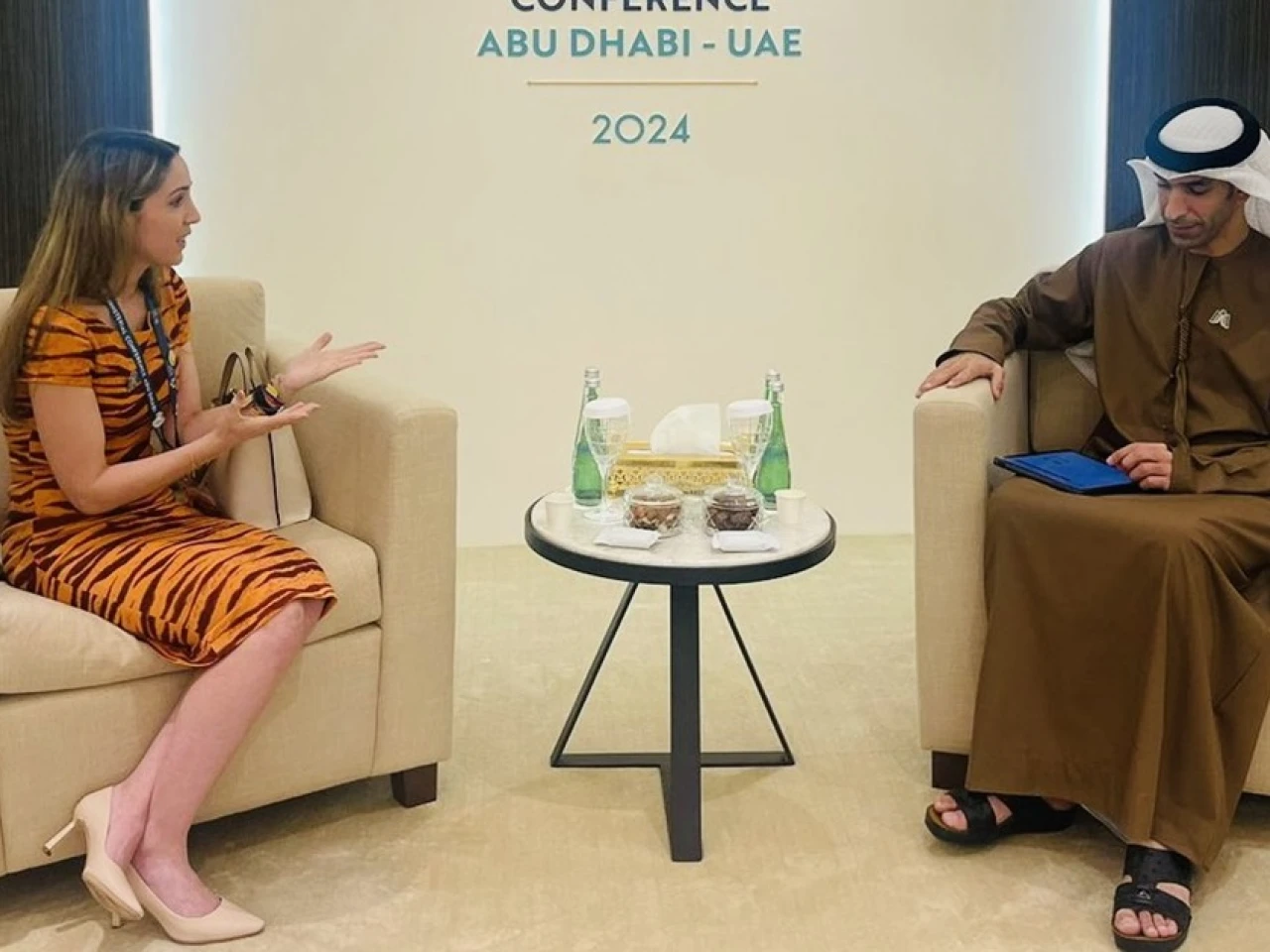 La ministra de Producción Sonsoles García en un diálog con Thani Al Zeyoudi, ministro de Comercio de Emiratos Árabes Unidos / Foto: cortesía Minsiterio de Producción