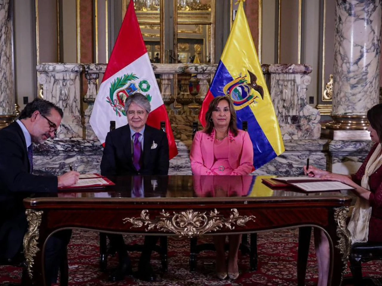 Lasso llegó a la capital peruana al mediodía de este miércoles y por la tarde comenzó sus actividades oficiales con una primera visita al Palacio de Gobierno, donde fue recibido con honores y se reunió con Boluarte, tras lo cual ambos gobernantes asistieron a la suscripción de acuerdos bilaterales.