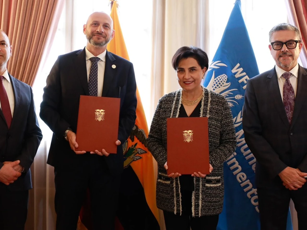En el evento de firma participaron la canciller ecuatoriana, Gabriela Sommerfeld, y el representante del PMA, Matteo Perrone, conjuntamente con el viceministro de Movilidad Humana, Alejandro Dávalos y el Subsecretario de la comunidad ecuatoriana migrante, Pablo Roldan.