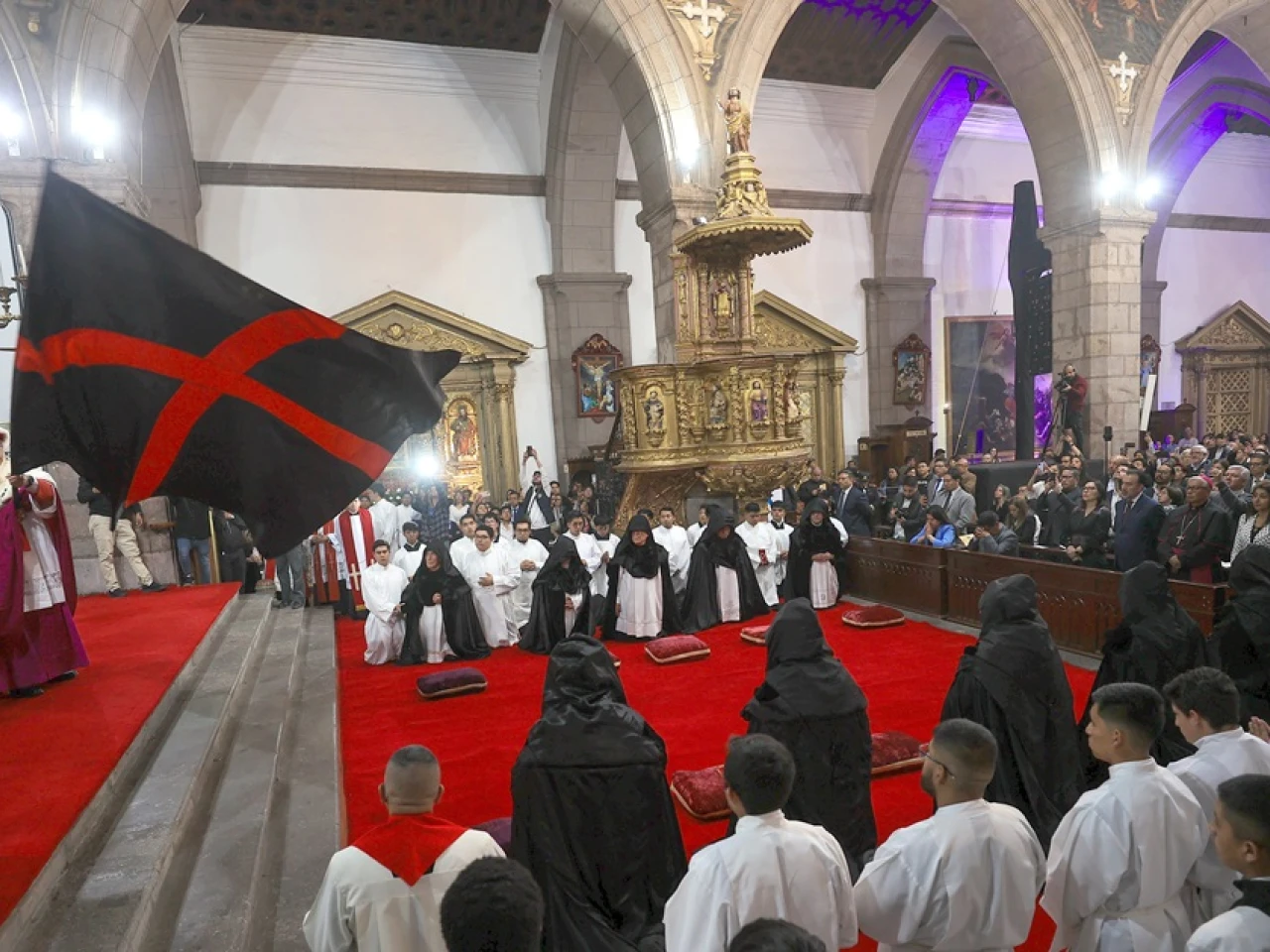 Quito, 16 abr (EFE).- Un año más, el Arrastre de Caudas volvió a escenificarse este miércoles en la Catedral Metropolitana de Quito, el único lugar del mundo donde se conserva la celebración de esta procesión fúnebre tradicional de la Semana Santa cuyo ritual se remonta a la época romana.