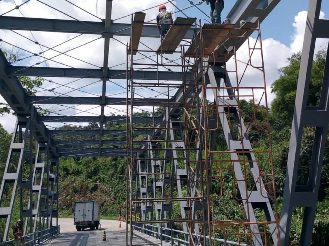 Un grupo de obreros labora en el puente sobre el río Jondachi, ubicado en el kilómetro 18 de la vía Tena -¨Y¨ de Baeza, en Napo. La tarea de pintar la estructura del puente tipo Acrow, de 65 metros, demanda el uso de estructuras y aplicación de rigurosas medidas de seguridad.