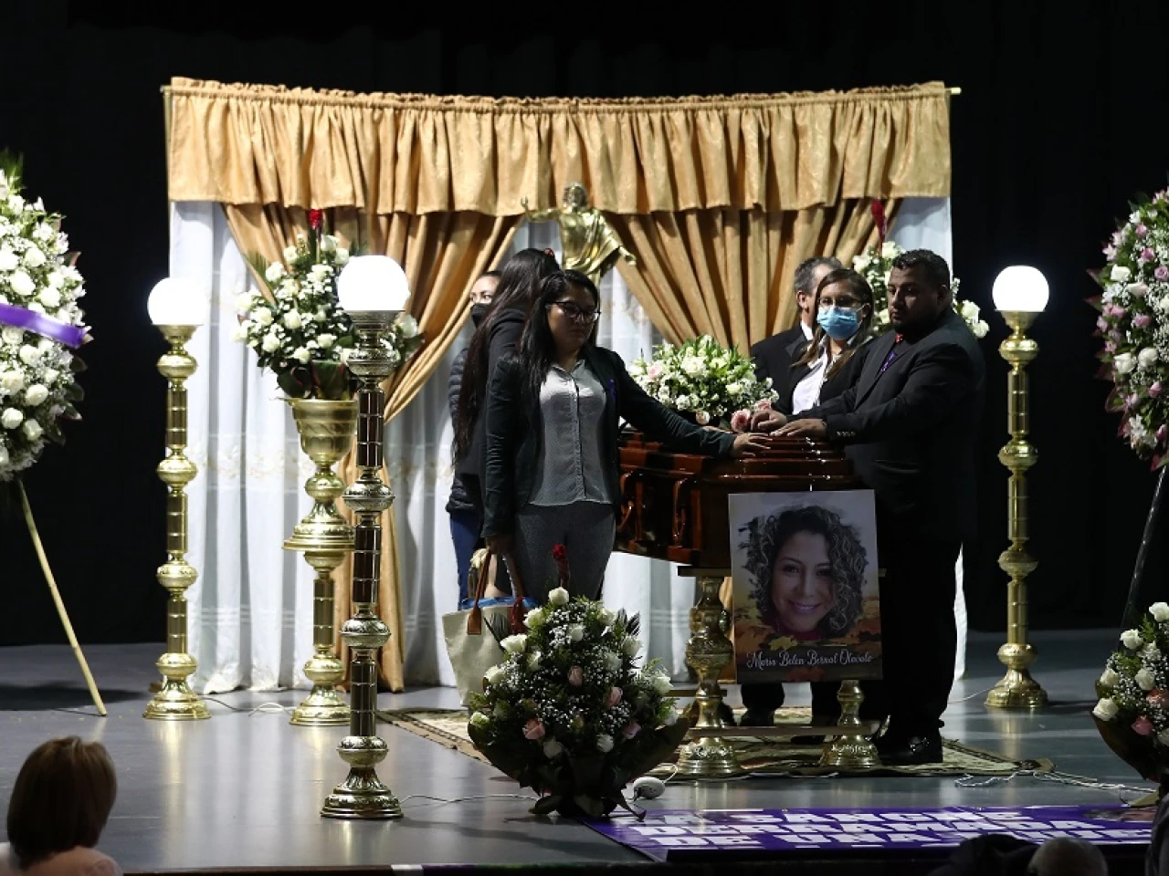 Tras practicarse la autopsia, el cuerpo de María Belén Bernal llegó este miércoles hasta el teatro de la Universidad Central del Ecuador, donde fue instalada una capilla ardiente ante una desconsolada Elizabeth Otavalo, la madre de la víctima, que a duras penas trataba de calmar al hijo de Bernal, de 13 años.