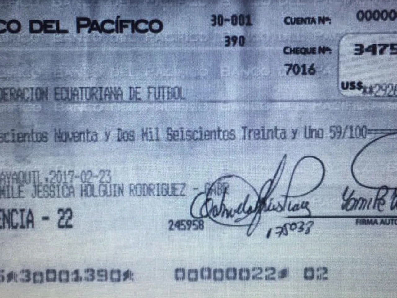 El cheque del Banco del Pacífico abre muchas interrogantes que deberían ser despejadas por la justicia, la Federación Ecuatoriana de Fútbol y el propio Banco del Pacífico.