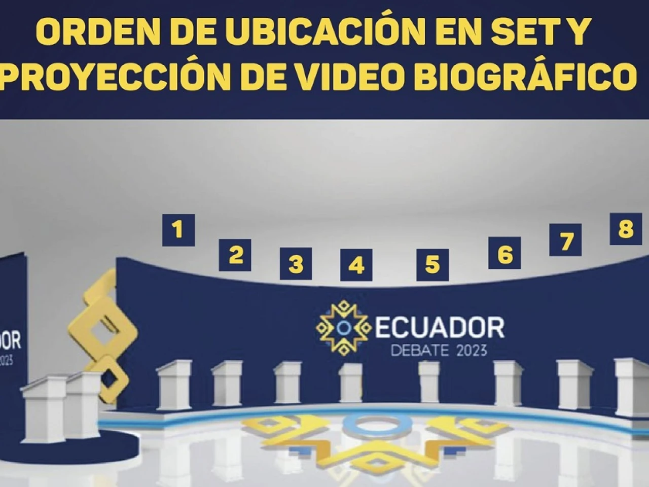 Previa a la definición del orden de las intervenciones, se sorteó la ubicación de los postulantes en el set, en el que estarán: Yaku Pérez, de la alianza "Claro que se puede"; Bolívar Armijos, de "Amigo"; Fernando Villavicencio, de "Construye" y Luisa González, del movimiento Revolución Ciudadana que lidera el expresidente Rafael Correa.