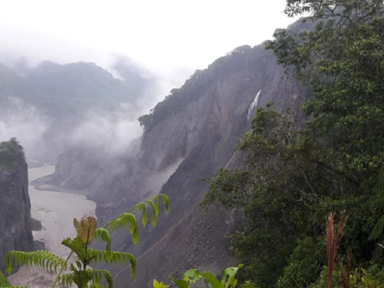 El desprendimiento de materiales rocosos ocasionó el represamiento del río Coca / Foto: cortesía de @Riesgos_Ec