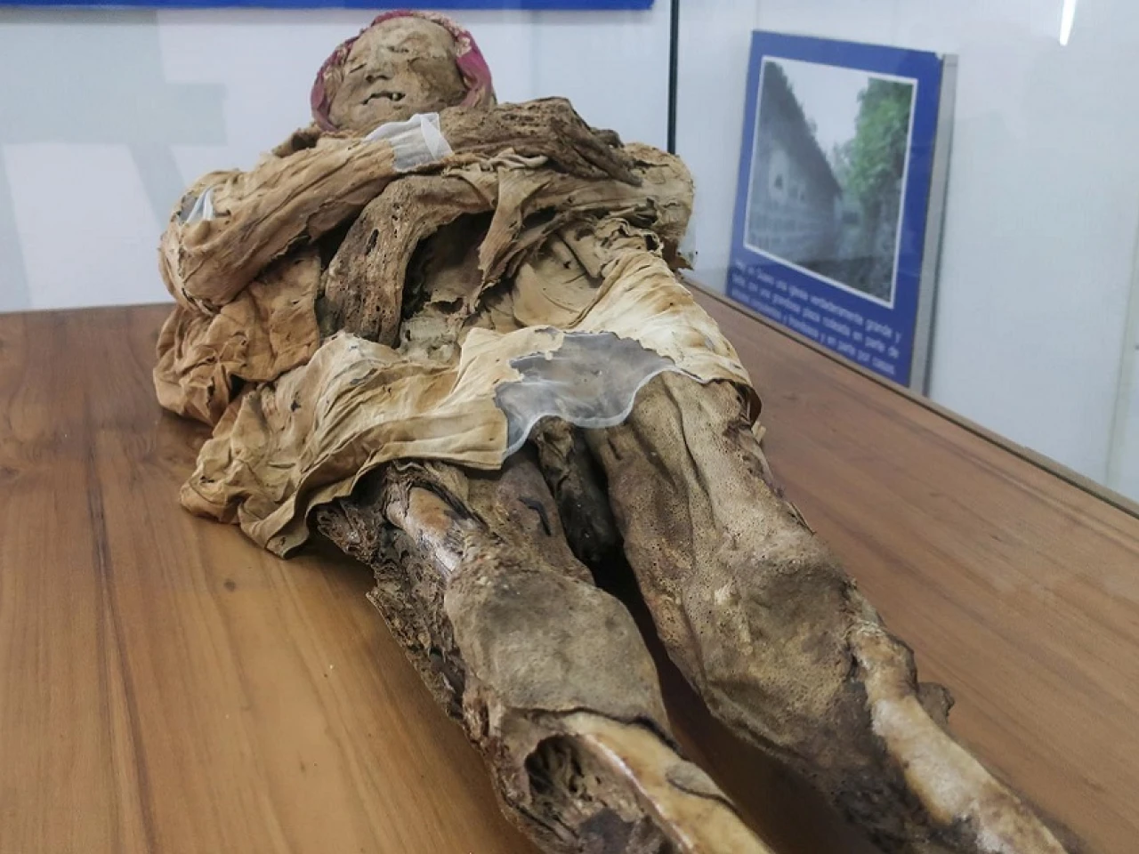 Allí, la momia está extendida en cúbito dorsal (boca arriba), con la cabeza semi inclinada hacia adelante, tiene los brazos cruzados y se puede, incluso, ver parte de la piel momificada y de los huesos expuestos, sobre todo de las piernas.