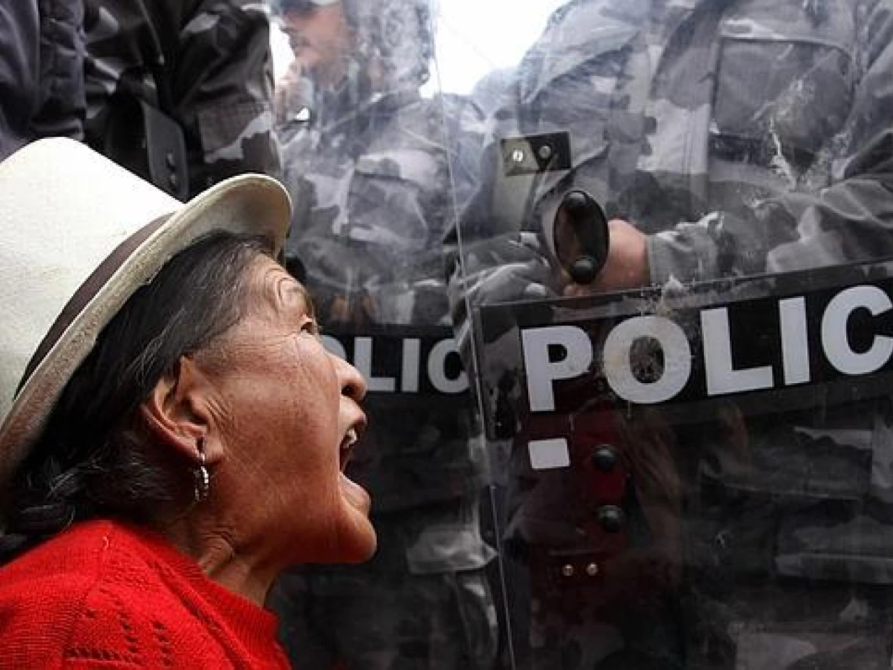 Una mujer indígena se encara con la Policía durante una protesta en la localidad ecuatoriana de Tarqui