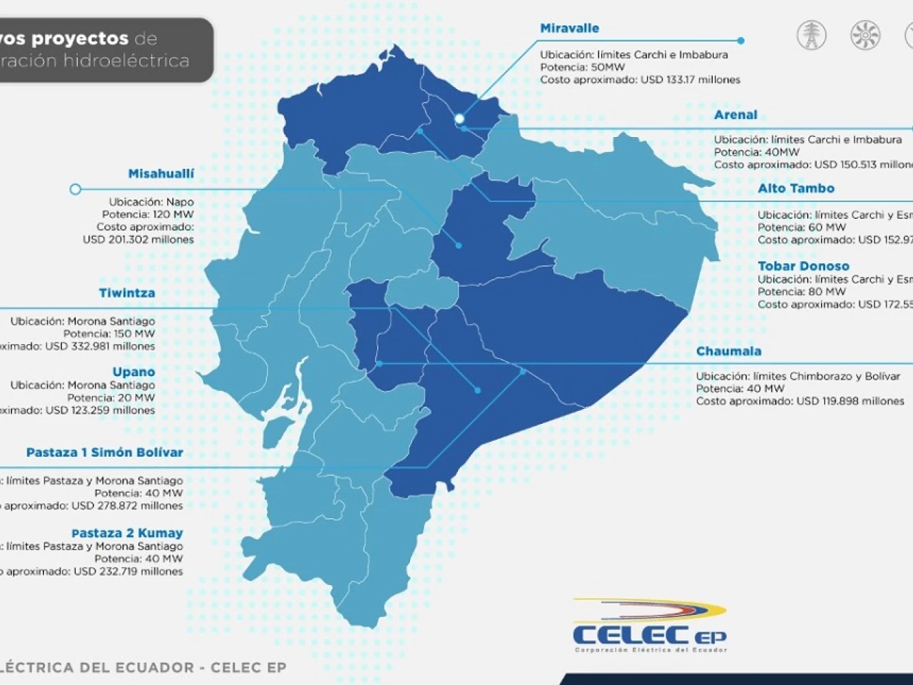 Los proyectos amazónicos estarán en Misahuallí (Napo), Tiwintza y Upano (Morona Santiago), Pastaza 1 Simón Bolívar y Pastaza 2 Kumay (límites de Pastaza y Morona Santiago).