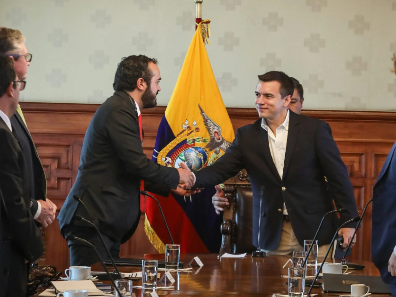 El presidente Daniel Noboa, junto al ministro de Economía, Juan Carlos Vega, y otras autoridades del gobierno, mantuvo un encuentro con el presidente de la Asociación de Municipalidades Ecuatorianas, (AME), Patricio Maldonado. Se evaluó mecanismos para solventar la deuda heredada de la administración anterior con los gobiernos locales.
