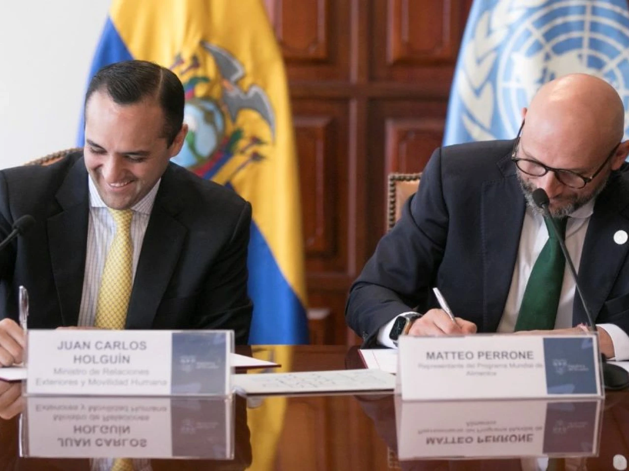 En la firma participaron el ministro de Relaciones Exteriores y Movilidad Humana de Ecuador, Juan Carlos Holguín, y el representante del PMA en Ecuador, Matteo Perrone.