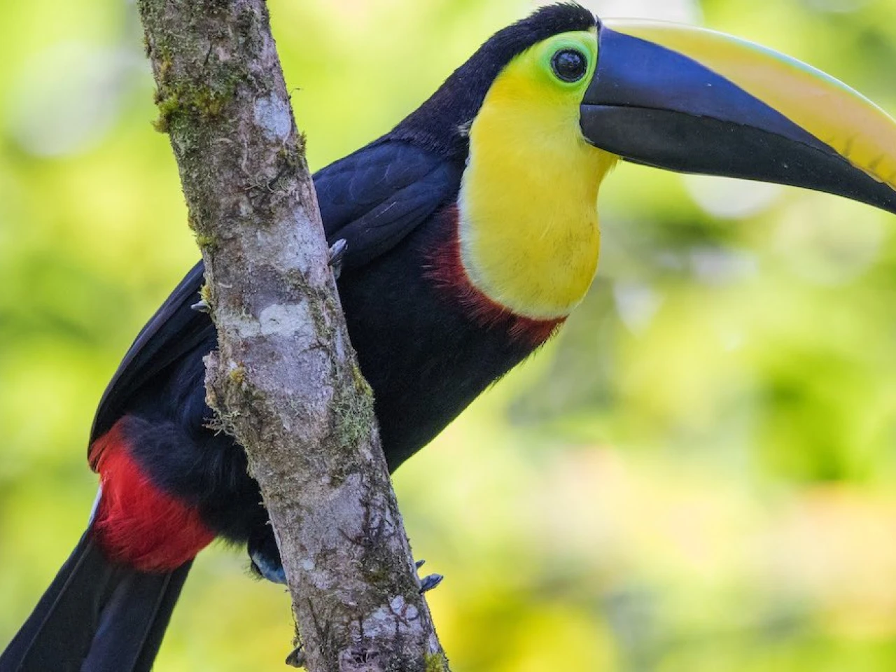 El tucán andino, que fulgura con su llamativo pico amarillo, habita en zonas subtropicales y en bosques húmedos como El Chocó.